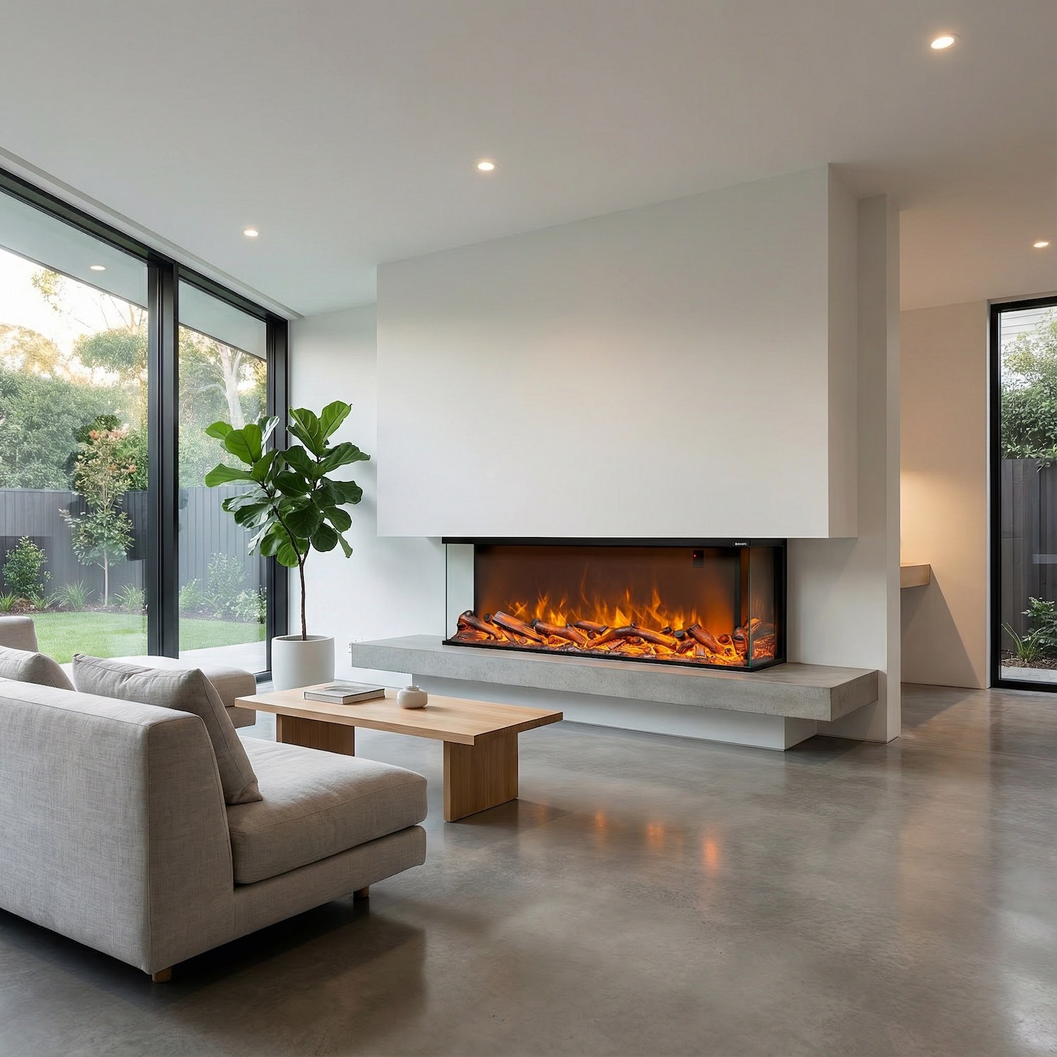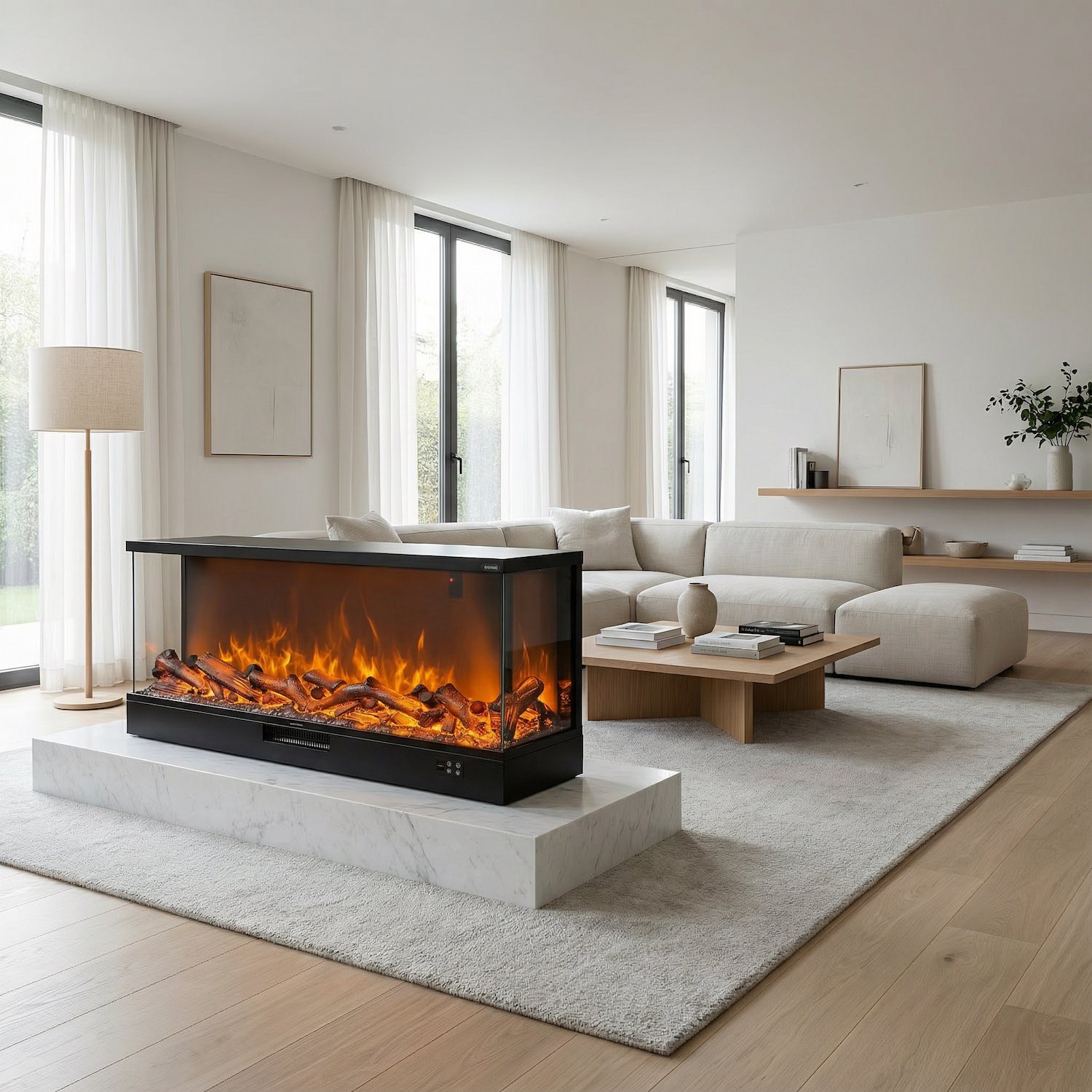 Esta chimenea eléctrica panorámica de tres lados le ofrece una llama que parece real, visible desde el frente y los lados, para un efecto escénico increíble. Tanto si está viendo la televisión, leyendo un libro o charlando con los amigos, la llama siempre estará ahí para proporcionarle el ambiente adecuado. Una chimenea eléctrica LED panorámica que puede ser tanto un elemento de diseño como una fuente de calor, perfecta para cualquier estación del año.